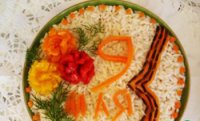 4._Украшаем сверху сладким перцем, темным рисом, морковкой, выкладываем георгиевскую ленту или поздравительную надпись. Приятного аппетита!