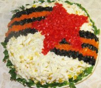 Скоро праздник, на который хочется порадовать своих близких каким-либо характерным и при этом вкусным блюдом. Рецепт данного салата весьма подойдет. Готовится все очень просто, получается сочным и вкусным. При этом с помощью оригинального оформления из салата можно сделать настоящую открытку с поздравлениями. Чтобы приготовить салат «День победы» нам понадобиться: