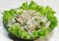 Грибы разрезаются пополам, тонко шинкуются. Грибы нужно добавить к луку, чуть посолить и вновь обжарить. Готовую смесь лука и грибов охладить. Огурчик нарезается кубиками, мелко крошится петрушка. Все это добавляется к мясу курочки. Маслины разрезаются на три частички и также добавляются в салат. Все ингредиенты размешиваются, заправляются майонезом, остужаются. Все нужно выложить в салатницы или порционные тарелки. Готовое блюдо украсить можно мелким луком. При желании в сам салат еще на этапе готовки можно добавить нарезанный кубиками сыр – он там также будет весьма гармоничен.