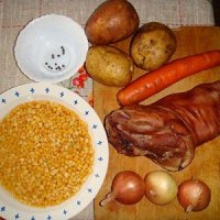 - одна копченая свиная рулька; - один стакан гороха; - три картофелины; - две морковки; - две головки лука репчатого.