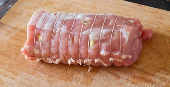 Сворачиваем неполным рулетом свинину, обвязываем кусок шпагатом или кулинарной ниткой.