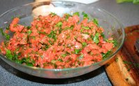 В это время готовим начинку. Для этого порежем слегка солёную рыбу на мелкие или средние кубики, измельчим укроп. Добавим укроп к рыбе и все перемешаем.
