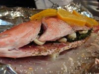 Если вы выбрали нежирный вид рыбы, то добавьте немного воды и закручивайте фольгу. При этом не прижимайте ее плотно к рыбе, делайте слегка свободную упаковку, чтобы рыба запекалась в парах и соки, которые вытекают из куска, не выпаривались.