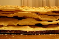 Разделяем тесто на восемь частей. Каждую из частей очень тонко раскатываем и выпекаем как корж. Перед отправлением на противень корж прокалываем вилкой, чтобы коржи не пузырились. Один из получившихся коржей используем как посыпку.