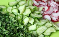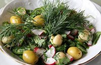 Редиска и огурцы разрезаются брусочками или кружочками по вкусу. Мелко нарезается зелень. Добавляем оливки, маринованные грибы, специи и хорошо перемешиваем.