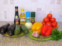 - два помидора - две луковицы - два перца болгарских - молодой кабачок - баклажан - свежая зелень - черный перец и соль - масло растительное для жарки