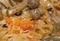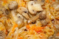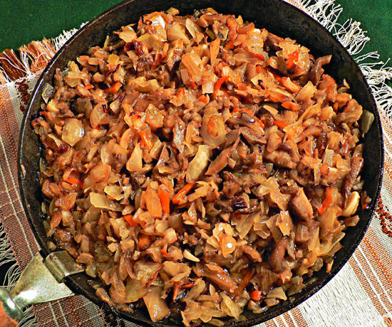 Половина протушенной капусты укладывается слоем на сковородку, на капусту выкладываются приготовленные грибы и затем опять капустный слой. Все посыпается сухарями и сбрызгивается маслом. Всю сковороду отправляем для запекания в духовку.
