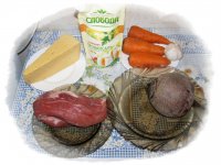 Что нам понадобиться для приготовления? - свекла вареная большая - несколько зубчиков чеснока; - грамм триста свинины или говядины; - несколько морковок; - грамм 250 сыра твердого; - майонез.