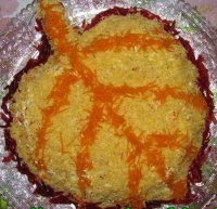 На блюдо листочком выкладывается свекла с чесноком. В пачке майонеза отрезается маленький уголочек, чтобы можно было поливать блюдо тоненькими полосками. Поливаем наш листик майонезом. Вторым слоем выкладывается мясо и также поливается майонезом. Третий слой – морковка. Опять поливаем майонезом. Натираем на терку сыр и посыпаем им блюдо.
