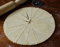 Тесто нужно вымесить достаточно быстро, обернуть в пищевую пленку и убрать на один час в холод. Тесто разделяется на четыре части, каждая скатывается в шар и после этого все раскатывается в круг диаметром в сантиметров тридцать с толщиной не больше половины сантиметра.