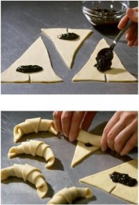 Каждый круг разрезаем на манеру пиццы (т.е. на восемь треугольных сегментов), каждый треугольник смазывается по всей поверхности повидлом, после этого тесто сворачивается от толстого уголка к более узкому. Рогалики, которые получились в итоге, слегка сгибаем подковкой. Выкладываем все на противень, застеленный пергаментом и выпекаем в нагретой до 210 градусах духовке. Готовится все примерно пол часика до зарумянивания.