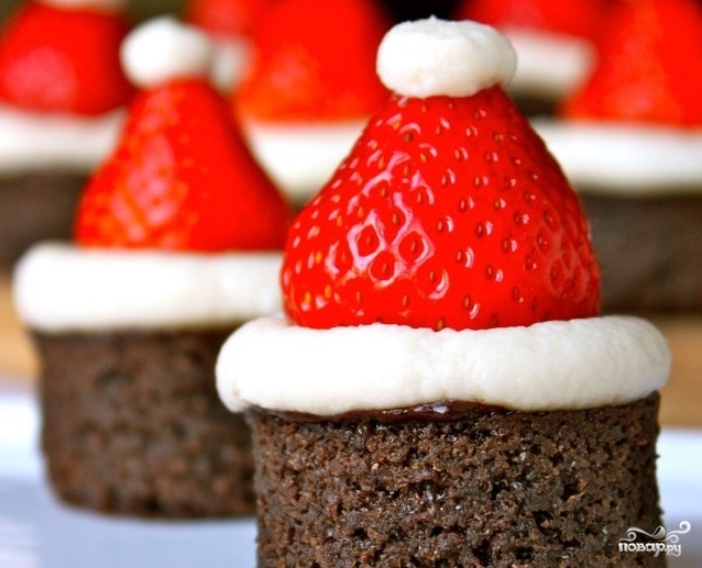 Приготовить новогодние пирожные под названием «Шапка Деда Мороза» можно совершенно на любой основе (это может быть дрожжевое тесто, брауни или бисквит). Нам понадобится также сыр сливочный, клубника. Основу при этом можно приготовить самому или купить.