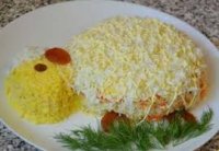 В вареных яйцах отделяем желтки и белки, все натираем на терке отдельно. Выкладываем белками тельце, а желтками украшаем мордочку.