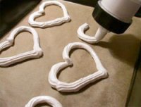 Взбиваем со щепоткой соли для безе белок, ввести опять сахар и взбить. Кондитерский шприц наполняем массой, делаем контуры сердечка согласно трафарету и запекаем при температуре 100 градусов 50 минут.