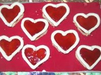 Вырезаем сердечки из бисквита по трафарету, смазываем все вареньем. На сердечки далее выкладываем контур.