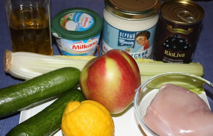- два огурца; - пол яблока; - грамм 300 филе курицы; - половинка лимона; - сельдерей;