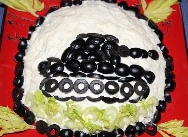 Промазываем майонезом и выкладываем из маслинок танк. Из листьев сельдерея можно сделать траву, салат можно украсить зеленью по вкусу.