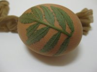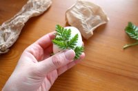 Нужно набрать любых травинок, молодых маленьких листочков разных форм. Распределяем на яйце наши рисунки из зелени. Аккуратно заворачиваем наши яйца в кусочки колготок.