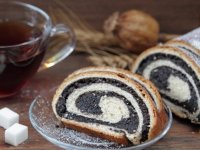 Тесто раскатываем в тонкий пласт, распределяем равномерно маковую начинку по всей поверхности. Тесто нужно в рулет свернуть таким образом, чтобы внутри оказался мак. Нарезаем высотой в пять сантиметров булочки.