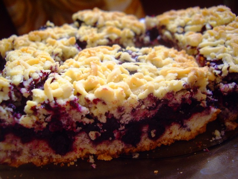 Тесто раскатываем размером с противень. Застилаем пекарской бумагой, отправляем туда пласт теста, все равномерно распределив. На тесто насыпаем слой смородины, сверху насыпаем крошку муки и маргарина.