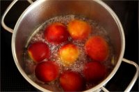 2._Растапливаем сливочное масло на маленьком огне в сотейнике, снимаем с огня и добавляем ром и коричневый сахар. Перемешиваем до растворения сахара. Все переливаем в большую миску, добавляем хорошо промытые разрезанные пополам без косточек персики. Хорошо все перемешиваем.