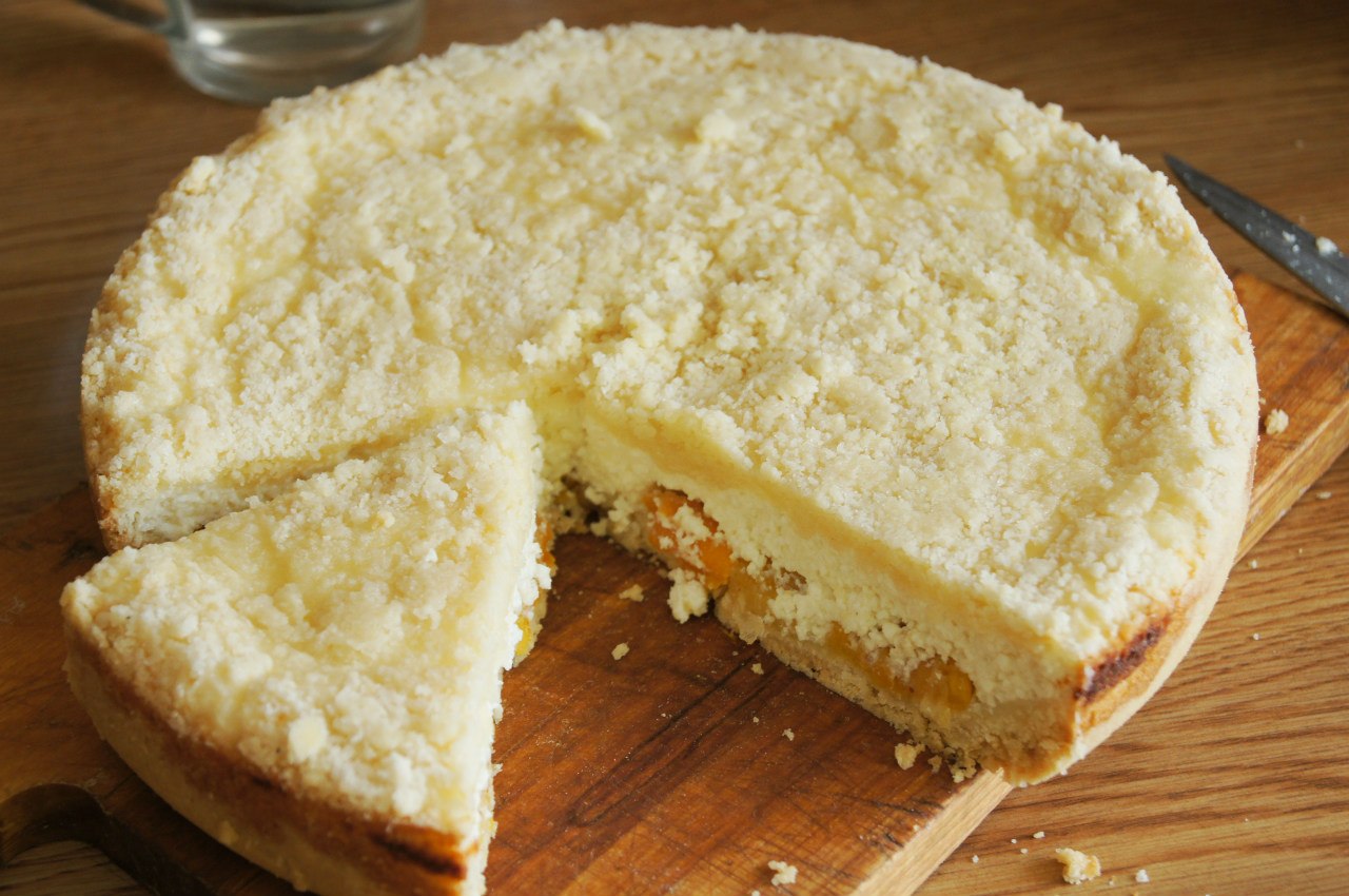 Смешиваем половину яйца, творог и 50 грамм сахара. Выкладываем на противень пирог.