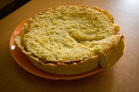 В начале большую половину теста. Внутрь пирога погружаем творожную начинку. Верхушку пирога защипываем оставшимся кусочком теста.