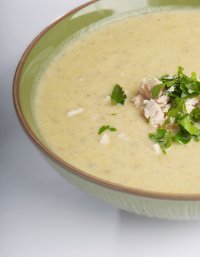 Солим блюдо, кидаем кинзу (пучком, перевязанным ниткой) варим на малом огне снимая пену. Подобный метод варки даст возможность получить очень вкусный необычный куриный бульон.