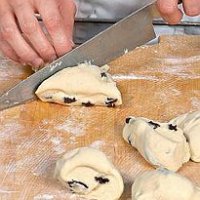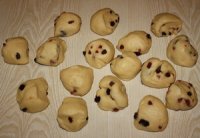 Перемешиваем дрожжи, сахар и муку. Замешиваем плотное тесто (добавляем для удобства вымешивания воду). Добавляем также к тесту чистый промытый изюм. Формируем булочки руками. Оставляем их минут на 10 постоять в тепле.