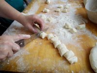 Посыпаем стол слегка мукой, выкладываем массу и раскатываем из нее две колбаски с одинаковой толщиной. Нарезаем все одинаковыми кусочками, при желании кусочки можно скатать в кружки.