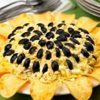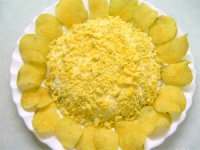 Каждый из слоев промазываем майонезом, в том числе также и верхний. Украшаем салат чипсами и натертыми желтками на мелкую терку. Формируем красивые цветы.
