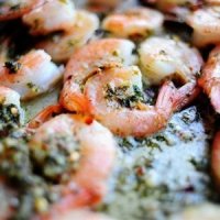 Выкладываем на каждую из креветок по чуть-чуть получившейся смеси. Держим в духовке все минут тридцать при 160 градусах. Готовые креветки выкладываем на блюдо и поливаем тем соком, который остался на противне.