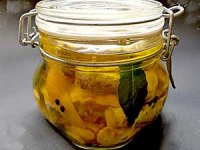 Филе складываем в простерилизованную банку в кипятке. Туда же в банку отправляем лавровый лист, перец горошком и чили перец. Можно некоторое время подержать емкость с рыбой в кипящей воде. Однако долго не стоит.
