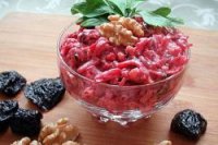 Что нужно для полезного свекольного салата? - одна свекла; - 15 штук чернослива; - три четверти стакана грецких орехов;