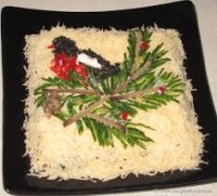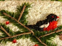 5. Формируем из нарезанных полосок огурца нечто вроде еловой веточки. Делаем из печени и варенной морковки птичку. Можно помочь себе зубочистками. При желании можно из печени сделать шишки, украсить все ягодками граната и так далее по вашему вкусу.