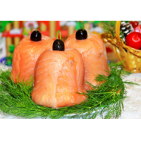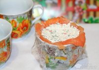 Закуска Рождественские колокольчики![]() - 200 грамм слабосоленой семги; - 200 грамм крабового мяса; - два куриных яйца; - три ложки столовые сметаны; - пучок лука зеленого; - оливки для украшения зеленые. Как готовить блюдо? ![]() Отвариваем яйца, очищаем их с крабовым мясом и мелко нарезаем. Можно даже прокрутить в блендере. Добавляем лук зеленый нарезанный а также сметану для большей эластичности. Хорошенько все перемешиваем. Охлажденную семгу нарезаем тонкими пластинками. Можно взять небольшие чашечки и застелить их пищевой пленкой. Выкладываем по бокам чашечки пластинки рыбы. Заполняем чашечку начинкой, слегка утрамбовываем. Формочки накрываем пленкой и отправляем на пару часов в холодильник. Закуску из семги достаем, чашечки переворачиваем на блюдо и подаем на праздничный стол. Приятного аппетита! |