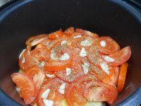 Что нужно для приготовления данного блюда? - семь картофелин; - пол кило свинины; - один болгарский перец; - один помидор;