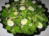 Для самого салата: - большой пучок салата (грамм 300); - 300 грамм мороженой стручковой фасоли; - 100 грамм изюма; - 100 грамм твердого сыра; - штук десять перепелиных яиц. Для заправки салата: - два желтка от яиц курицы; - две чайных ложки горчицы; - три столовые ложки сока лимона; - один зубец чеснока; - 100 мл растительного масла; - две чайные ложки меда; - перец и соль.