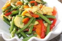 - пол кило стручковой зеленой фасолью; - один болгарский перец; - 250 грамм куриного филе; - две столовые ложки соуса соевого; - три столовые ложки растительного масла; - по вкусу соль. - три зубца чеснока.
