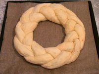 Сплетаем косу из жгутиков и выкладываем венком на противень. Даем венку подойти, промазываем желтком и отправляем в духовку.