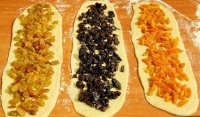 Как только вдвое тесто увеличиться, вымешиваем его тщательно. Разделяем на три части, раскатываем каждую часть в виде полоски с шириной в сантиметров 10. На каждую полоску раскладывается начинка – мак, курага, орехи, изюм или другие по желанию. Получится должны три рулетика с разной начинкой.